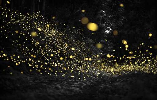 Koseki snaps multiple exposures in a single frame, layering the glowing spheres of light and parabolic flight paths of numerous fireflies over landscapes featuring trees, waterfalls, woodland creatures, and distant horizons.